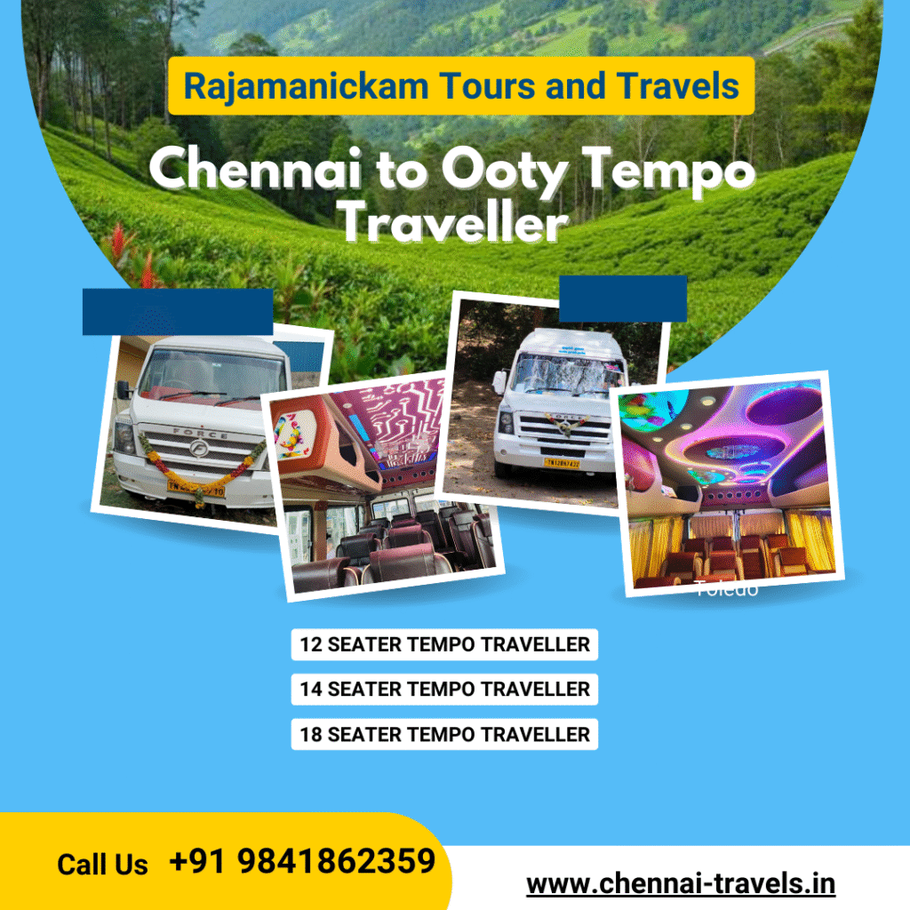 We Offer Chennai to Ooty Tempo Traveller Rentals 12+1 Seater, 14+1 Seater, 18+1 Seaters. Tariff Starts 12 Seater AC Tempo Traveller Chennai to Ooty Per Km Rate Rs.21/-, Per Day Driver Bata Rs.700/- along with Ooty Hill Charges Round trip Rs.1500/- Chargeable. For Booking Chennai to Ooty Van Rental Service Pl Call Us +91 9841862359